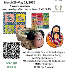 An instructor from Palette Art Studio will be hosting an after-school art enrichment session. We will complete four projects during our 8 week session: Chinoiseries Bunny painting, sheep pottery, Affirmation/Scripture cards, and a special Mother’s Day gift.